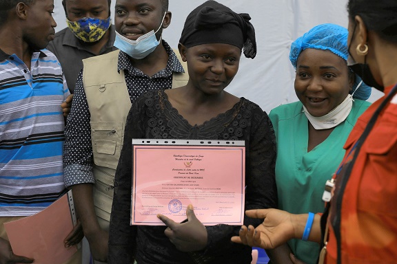 11月4日,在剛果(金)北基伍省貝尼,埃博拉患者在治愈后手持證書(shū)準(zhǔn)備出院。