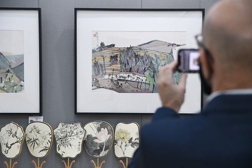 12月2日,馬耳他藝術(shù)協(xié)會主席阿德里安·馬莫在馬耳他首都瓦萊塔舉行的當(dāng)代中國畫藝術(shù)展上拍照。