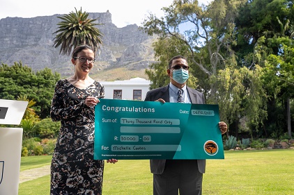 12月6日,在南非立法首都開普敦,南非西開普省負責農(nóng)業(yè)的官員伊萬·邁爾(右)在白蘭地創(chuàng)意比賽頒獎活動中為獲勝者頒獎。