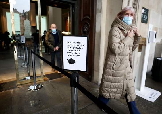 12月7日,人們走過英國倫敦大英博物館入口處的防疫告示。