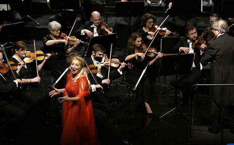2月6日,在奧地利薩爾茨堡,奧地利女高音歌唱家維多利亞·瓦爾加(前左)在“中華風(fēng)韻”新春音樂(lè)會(huì)上表演。新華社發(fā)(佟薇薇攝)