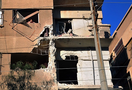 這是2月9日在敘利亞大馬士革郊區(qū)拍攝的在空襲中受損的建筑。
