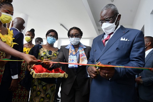 2月24日,剛果(布)總理馬科索(右)在布拉柴維爾為人工智能研究中心剪彩。
