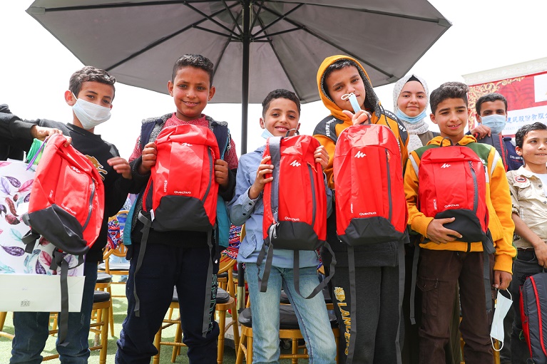 4月16日,在埃及開羅,孩子們在齋月慈善活動上展示收到的書包。