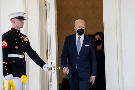 4月11日,美國(guó)總統(tǒng)拜登(左二)準(zhǔn)備在華盛頓白宮發(fā)表講話。新華社記者劉杰攝