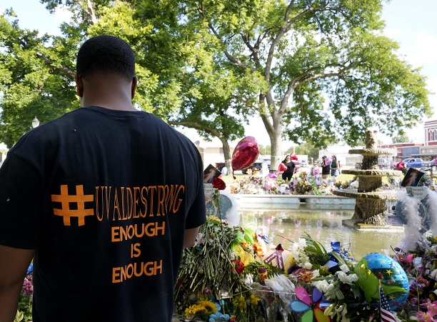 5月31日,在美國(guó)得克薩斯州南部尤瓦爾迪市的城市廣場(chǎng),人們悼念槍擊事件遇害者。