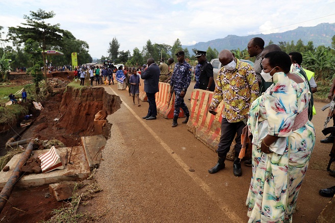 7月31日,烏干達(dá)總理羅比娜·納班賈(前右一)等政府官員在烏東部的姆巴萊區(qū)檢查受損道路。