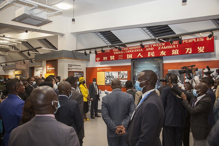 8月10日,在贊比亞盧薩卡省瓊圭地區(qū),來賓參觀坦贊鐵路紀念園內(nèi)的紀念館。
