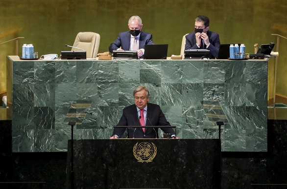 9月20日,在位于紐約的聯(lián)合國總部,聯(lián)合國秘書長古特雷斯(下)在聯(lián)合國大會一般性辯論開幕式上講話。 新華社記者 王迎 攝