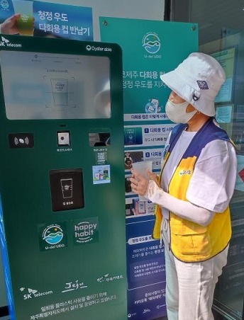 一般游客在進(jìn)入牛島前,可以在碼頭等處掃碼,簽署支持牛島資源循環(huán)運(yùn)動(dòng)的聲明。游客用完島上餐飲商鋪提供的可重復(fù)使用塑料杯后,可將其放入回收設(shè)備,回收后的杯子經(jīng)過(guò)清洗、消毒等流程后將被重復(fù)利用。為鼓勵(lì)游客積極參與,回收終端提供積分、現(xiàn)金返還和交通卡充值等形式的獎(jiǎng)勵(lì)。此外,對(duì)于沒(méi)有用完的塑料杯,游客可以帶出牛島,在濟(jì)州島主要交通設(shè)施、指定咖啡店等處利用回收設(shè)備進(jìn)行回收。