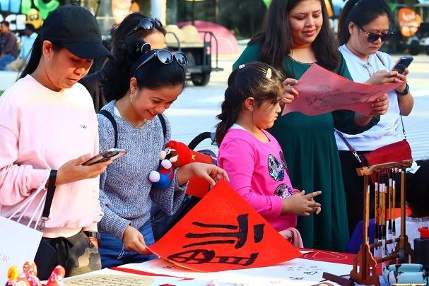 迪拜世博城迎來(lái)2023“歡樂(lè)春節(jié)”大巡游。圖為1月14日,在阿聯(lián)酋迪拜世博城,人們?cè)谥袊?guó)·自貿(mào)試驗(yàn)區(qū)開封片區(qū)搭建的“歡樂(lè)春節(jié)”非遺廟會(huì)專題展位欣賞書法作品。 新華社發(fā)
