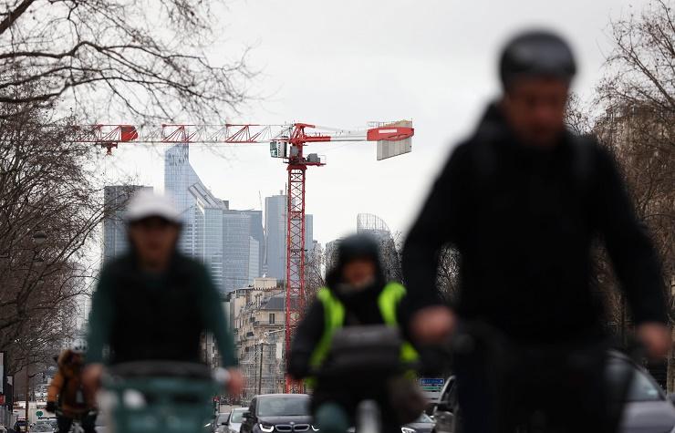 這是2月1日在法國巴黎拍攝的拉德芳斯商務區(qū)及塔吊。新華社記者 高靜 攝
