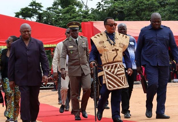 5月20日,在剛果(布)桑加省首府韋索市,剛果(布)總統(tǒng)薩蘇(前排中)出席韋索-博科拉道路及桑加大橋項(xiàng)目開(kāi)工典禮。新華社發(fā)(中國(guó)路橋公司供圖)