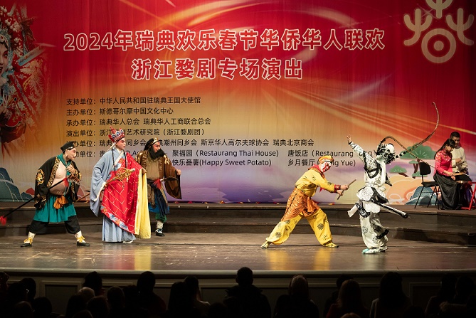 2月2日,瑞典斯德哥爾摩中國(guó)文化中心在斯德哥爾摩舉辦活動(dòng),通過美食、年畫、彩燈、舞龍和婺劇等多種形式,讓當(dāng)?shù)孛癖姾腿A僑華人享受了一場(chǎng)“歡樂春節(jié)”的文化大餐。這是演員在活動(dòng)中表演婺劇。新華社發(fā)(魏學(xué)超攝)