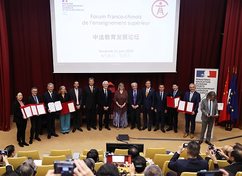 6月21日,中國教育部與法國高等教育和科研部在法國巴黎共同舉辦首屆中法教育發(fā)展論壇。中國教育部部長懷進鵬(左六)與法國高等教育和科研部部長勒塔約(右七)共同出席論壇并致辭。新華社記者 高靜 攝