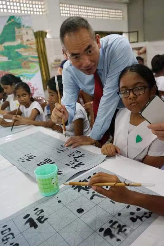 斯里蘭卡中國(guó)文化中心主任倪利生手把手教本地學(xué)生執(zhí)筆寫(xiě)“?!?/p>