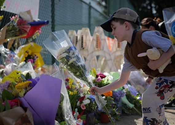 4月27日,在加拿大溫哥華駕車撞人事件發(fā)生地附近,一名男孩擺放鮮花悼念遇難者。新華社發(fā)(梁森攝)