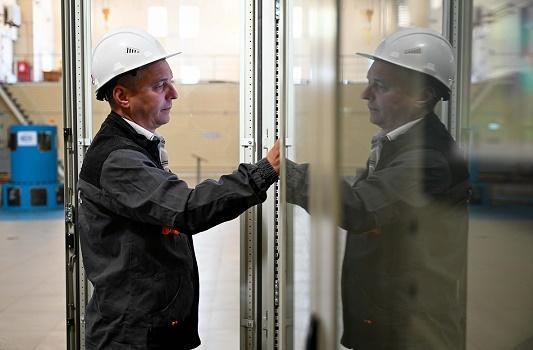 5月8日,在哈薩克斯坦東哈州的圖爾古孫水電站,水電站現(xiàn)場調(diào)度員涅波米亞什奇在發(fā)電機層巡檢水輪發(fā)電機組運行狀態(tài)。新華社記者 李任滋 攝