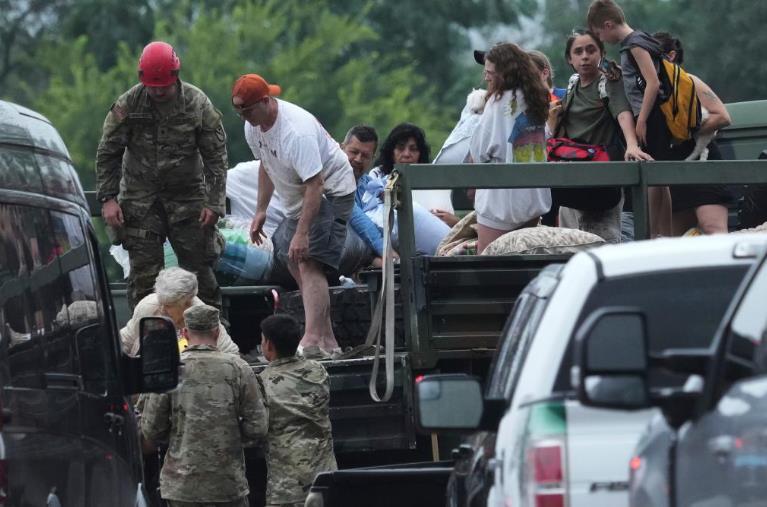 7月4日,在美國得克薩斯州英格勒姆市,應(yīng)急人員轉(zhuǎn)移受洪水影響的民眾。新華社/美聯(lián)