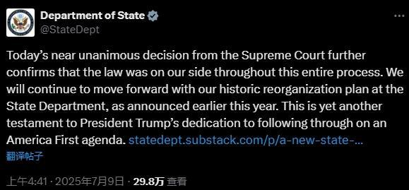 美國(guó)國(guó)務(wù)院當(dāng)天在社交媒體上發(fā)文說(shuō):“我們將繼續(xù)推進(jìn)國(guó)務(wù)院的歷史性重組工作。”