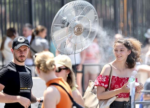 受“熱穹頂”影響,6月以來,乃至進(jìn)入7月,極端高溫天氣席卷北半球多國。圖為6月27日,在意大利羅馬,游客在斗獸場附近一處風(fēng)扇下納涼。 新華社記者 李京 攝