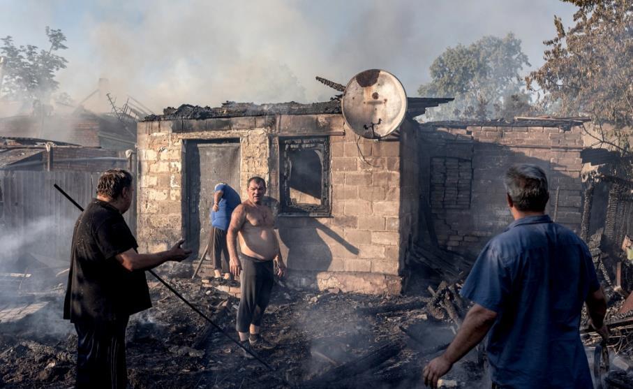圖為當(dāng)?shù)貢r(shí)間2025年7月16日,烏克蘭康斯坦丁尼夫卡,俄羅斯炮擊該市后,烏克蘭平民試圖撲滅一處房屋火災(zāi)。 CFP供圖