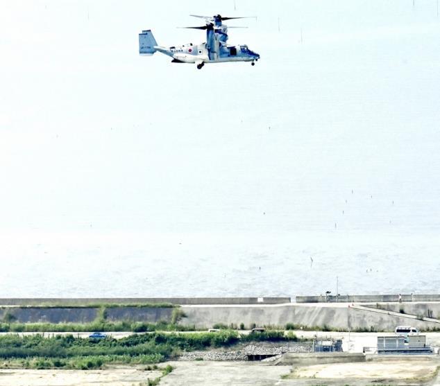 圖為當(dāng)?shù)貢r(shí)間2025年7月9日,日本佐賀市,一架日本陸上自衛(wèi)隊(duì)V-22“魚鷹”運(yùn)輸機(jī)抵達(dá)陸上自衛(wèi)隊(duì)新啟用的佐賀駐地。 CFP供圖