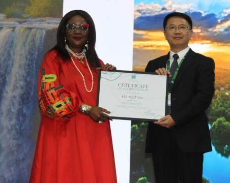 7月24日,在津巴布韋維多利亞瀑布城開幕的《濕地公約》第十五屆締約方大會上,《濕地公約》秘書長穆松達(dá)·蒙巴為中國浙江杭州代表頒發(fā)“國際濕地城市”證書。新華社發(fā)(塔法拉攝)