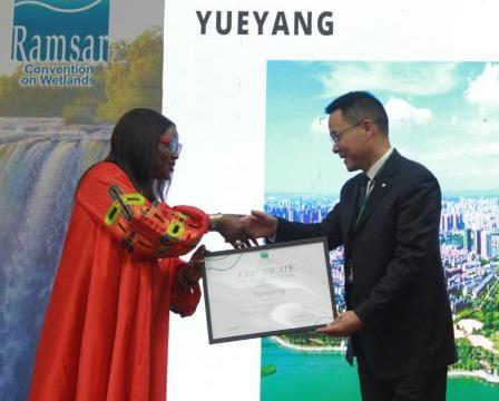 7月24日,在津巴布韋維多利亞瀑布城開幕的《濕地公約》第十五屆締約方大會上,《濕地公約》秘書長穆松達(dá)·蒙巴為中國湖南岳陽代表頒發(fā)“國際濕地城市”證書。新華社發(fā)(塔法拉攝)