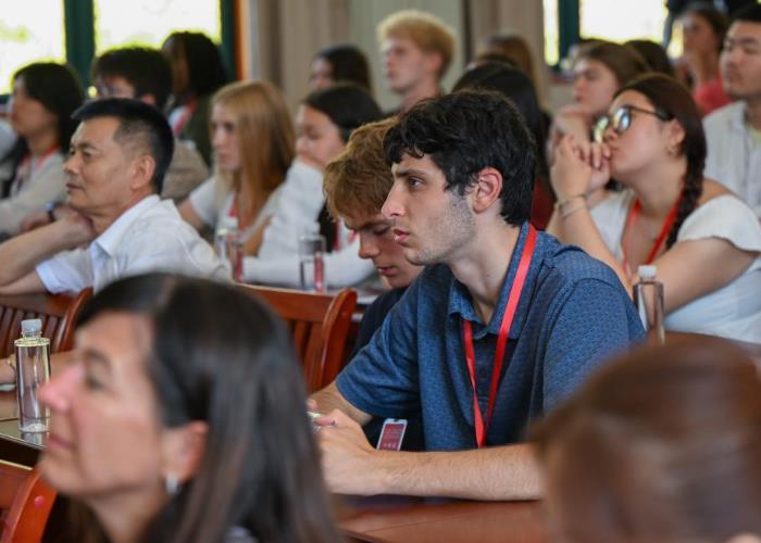 7月28日,在湖北省黃岡市紅安縣,美國飛虎隊夏令營代表團(tuán)成員觀看紀(jì)錄片《飛虎情緣》。