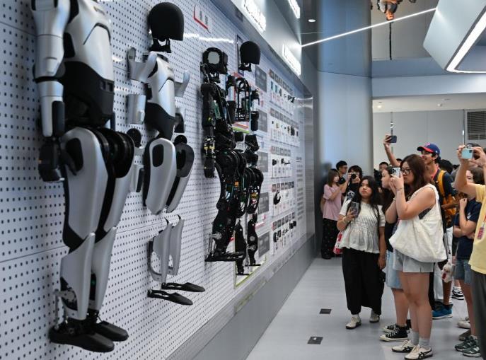 7月29日,美國飛虎隊夏令營代表團(tuán)成員在湖北省武漢市湖北人形機(jī)器人創(chuàng)新中心參觀。