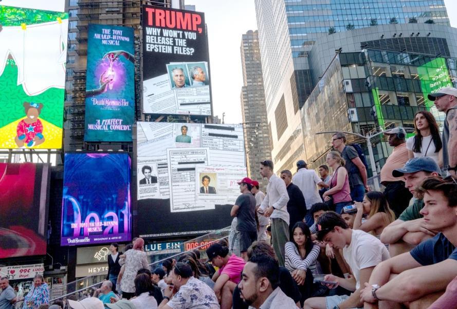 圖為當(dāng)?shù)貢r(shí)間7月23日,美國(guó)紐約時(shí)報(bào)廣場(chǎng)廣告牌呼吁公開愛潑斯坦案所有文件。 CFP供圖