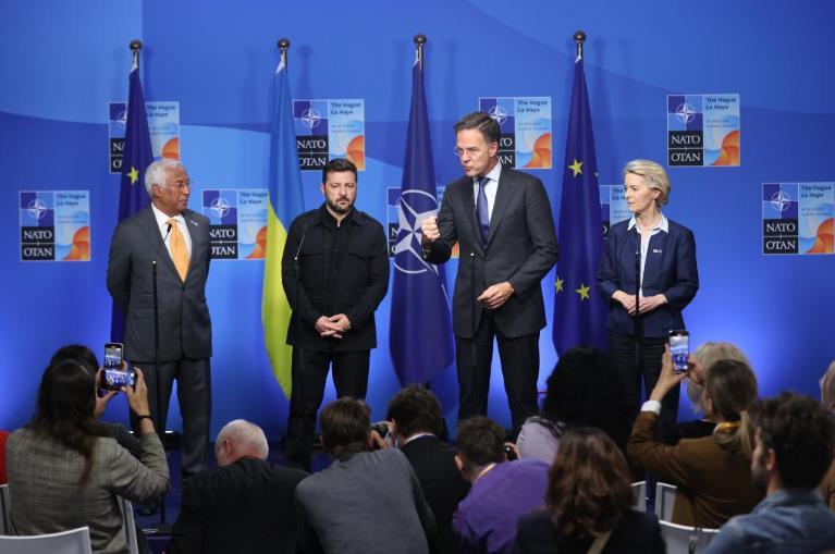 6月24日,在荷蘭海牙,歐洲理事會(huì)主席科斯塔、烏克蘭總統(tǒng)澤連斯基、北約秘書長呂特和歐盟委員會(huì)主席馮德萊恩(從左至右)在北約峰會(huì)期間共見記者。新華社記者 趙丁喆 攝
