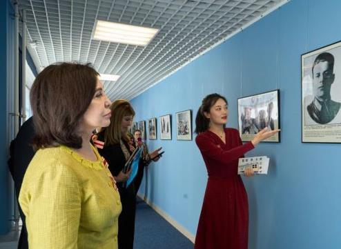 9月2日,在俄羅斯符拉迪沃斯托克舉辦的“百煉成鋼的真心朋友”——紀念中國人民抗日戰(zhàn)爭暨世界反法西斯戰(zhàn)爭勝利80周年圖片展上,老師為學生講解。新華社發(fā)(郭飛洲攝)