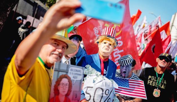 8月至9月,全球多個國家和地區(qū)的民眾舉行抗議活動,反對美國關(guān)稅政策。圖為巴西民眾在美國駐圣保羅總領(lǐng)事館前抗議美國對巴西征收高額關(guān)稅。 CFP供圖