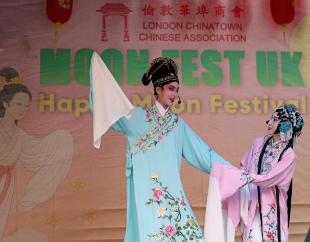 10月5日,演員在英國倫敦舉行的中秋節(jié)慶?;顒由媳硌輵蚯P氯A社記者 李穎 攝