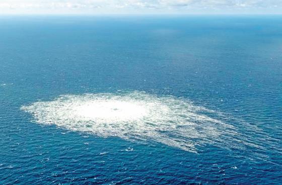 圖為丹麥國防部2022年9月27日發(fā)布的航拍照片顯示的是一處“北溪”天然氣管道泄漏點(diǎn)。 新華社發(fā)