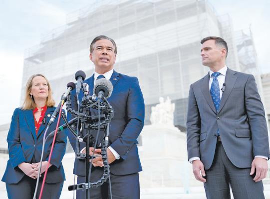 當?shù)貢r間11月5日,美國華盛頓特區(qū),美最高法院就政府關(guān)稅政策合法性舉行聽證會后,加州司法部長羅伯·邦塔(中)等人在最高法院外向媒體發(fā)表講話。 CFP供圖