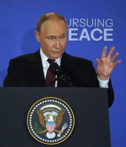 8月15日,俄羅斯總統(tǒng)普京與美國總統(tǒng)特朗普(未在畫面中)在美國阿拉斯加州安克雷奇市埃爾門多夫-理查森聯(lián)合軍事基地舉行會晤后共同出席聯(lián)合記者會。新華社記者吳曉凌攝
