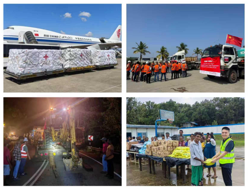 配圖左上:中國救援物資運(yùn)抵科倫坡。配圖右上:中國港灣救援隊準(zhǔn)備出發(fā)。配圖左下:中企救援隊伍夜間調(diào)度現(xiàn)場。配圖右下:中建斯里蘭卡分公司向受災(zāi)民眾發(fā)放物資。韓博 攝