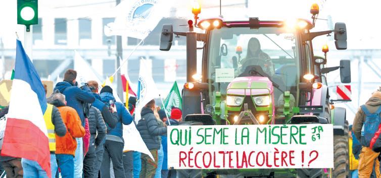 圖為當(dāng)?shù)貢r間1月20日,法國斯特拉斯堡,來自歐洲各地的約5400名農(nóng)民和700輛拖拉機(jī)在歐洲議會前示威,抗議簽署歐盟—南共市自貿(mào)協(xié)定。 CFP供圖