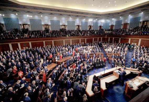 圖為當?shù)貢r間2026年2月24日,美國總統(tǒng)特朗普在國會聯(lián)席會議上發(fā)表國情咨文。 CFP供圖