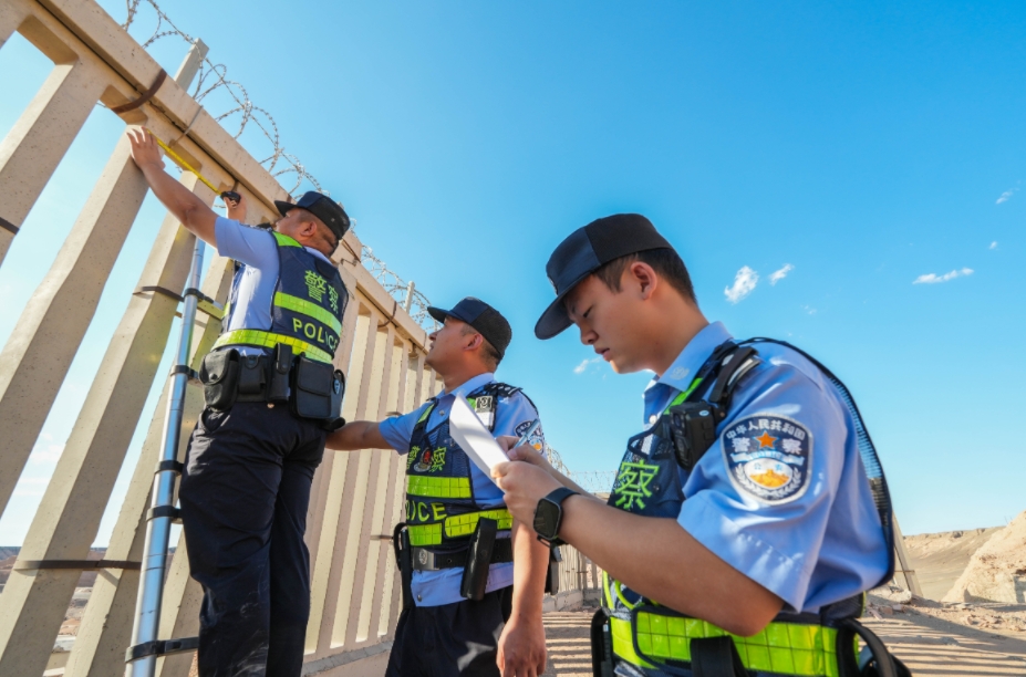 圖為8月27日,哈密公安處吐哈站派出所民警對轄區(qū)線路開展隱患排查,確保列車運行安全暢通。