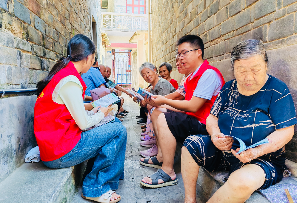 圖為普法志愿者在靖安縣南門(mén)社區(qū)巷道內(nèi)向群眾講解反詐知識(shí)。