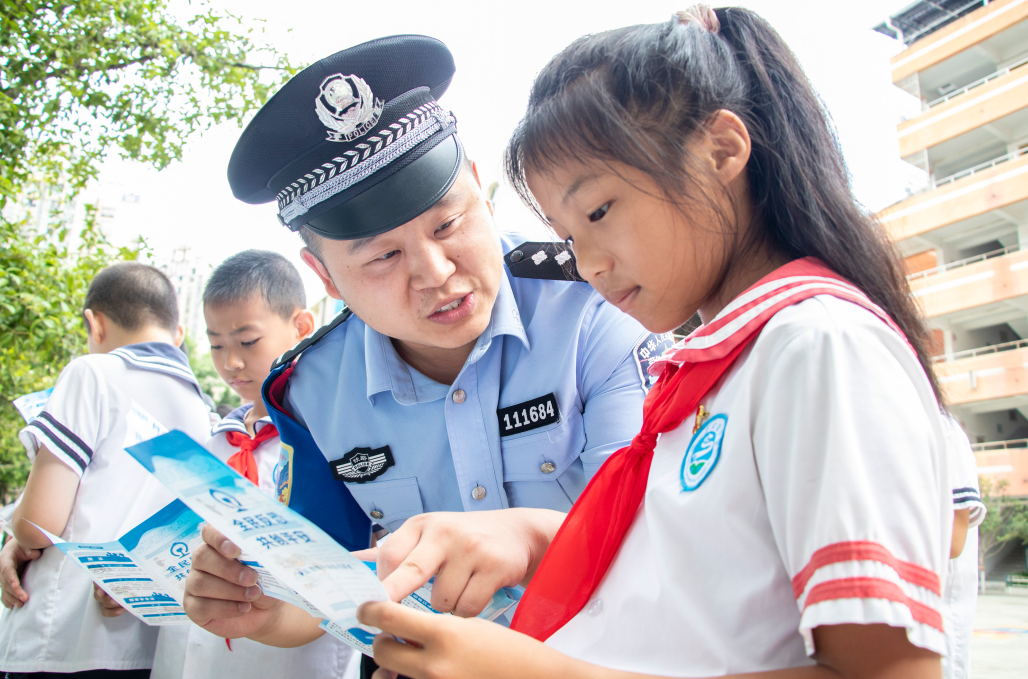 圖為9月12日,在重慶市巫山縣實(shí)驗(yàn)小學(xué)操場,巫山站派出所民警向?qū)W生們普及法律知識(shí)。