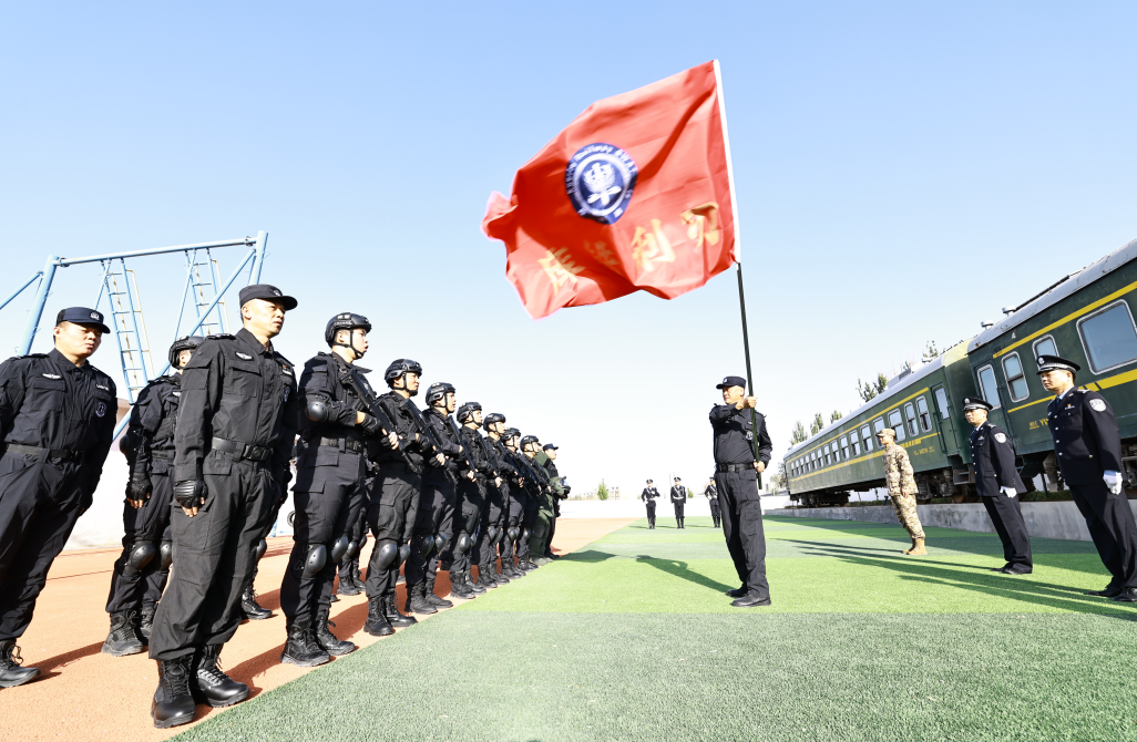 圖為10月10日,烏魯木齊鐵路公安局庫爾勒公安處特警支隊(duì)授旗儀式現(xiàn)場。