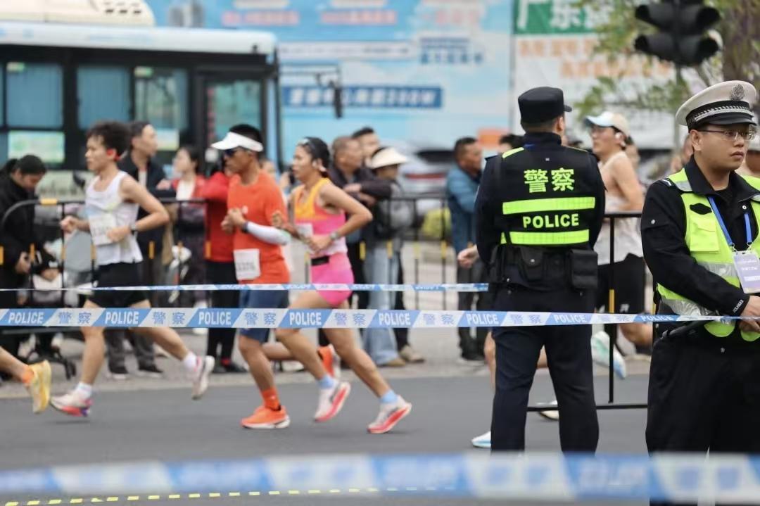 賽事過程中,民警們時刻關(guān)注選手狀態(tài),對突發(fā)抽筋、暈倒等情況的參賽選手第一時間實(shí)施緊急救助,以“溫情藍(lán)”守護(hù)每一位跑者的安全。