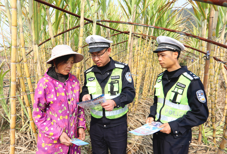 圖為12月16日,民警在鳳陽鎮(zhèn)甘蔗種植基地向村民宣傳交通安全知識。