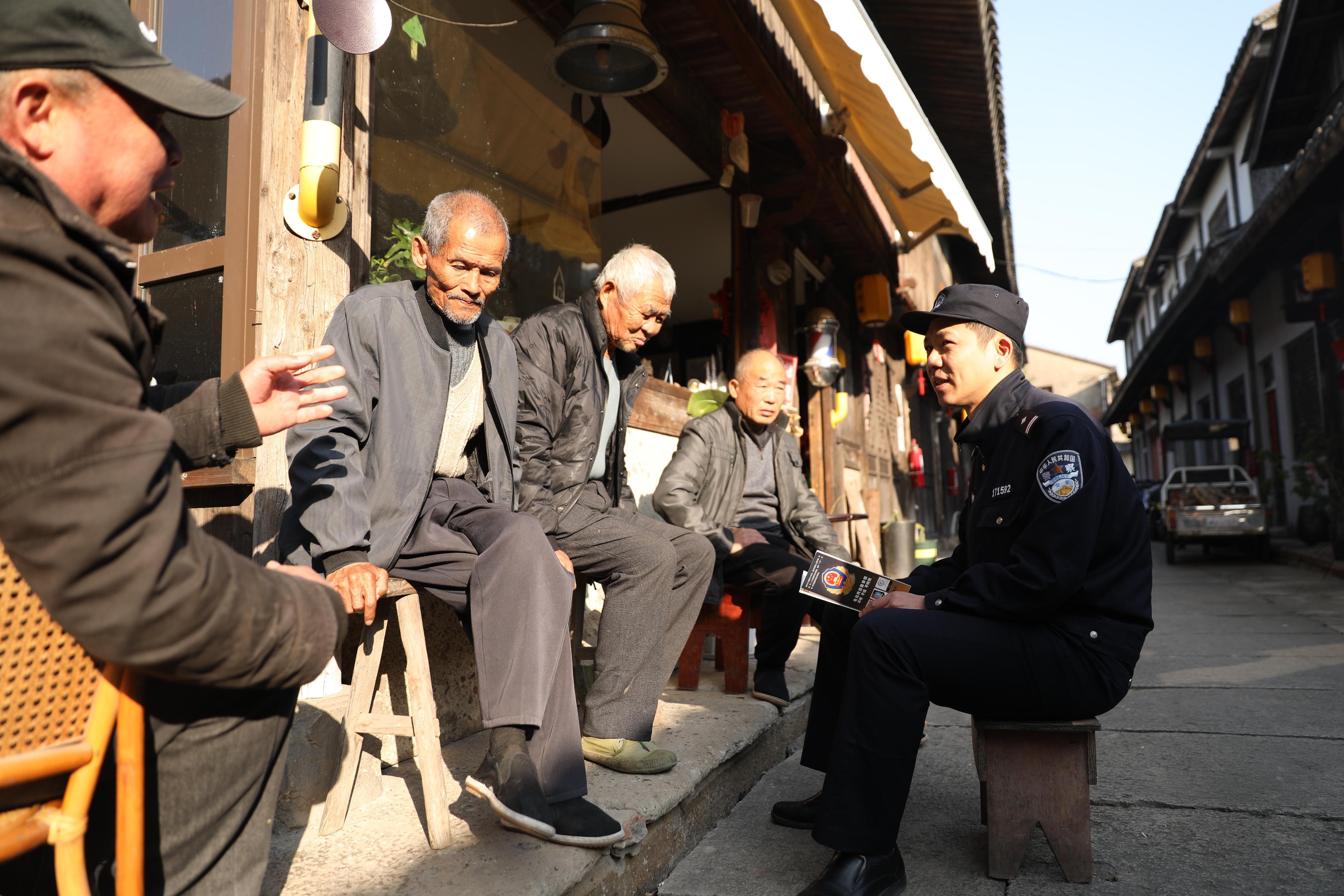 12月15日,浙江省臺州市公安局椒江分局下陳派出所民警走進(jìn)轄區(qū)古村落橫河陳村向群眾宣講反詐騙知識。