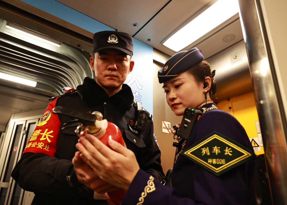圖為首發(fā)列車乘警張驥昂與列車長共同開展消防安全隱患排查。
